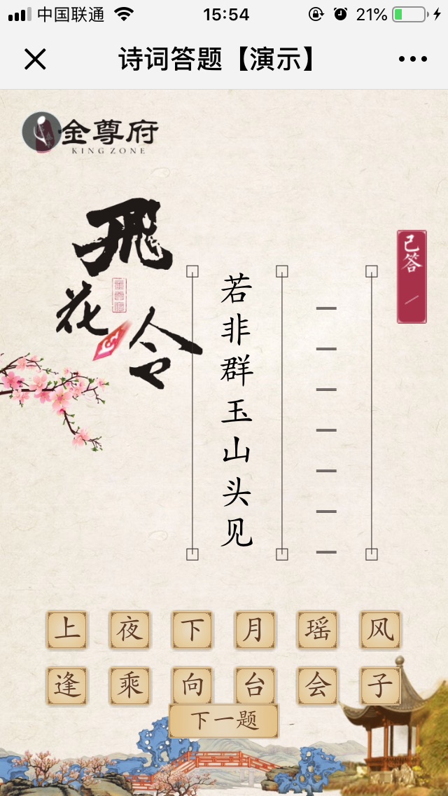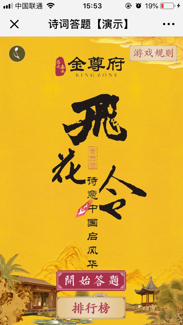 【游戏说明】飞花令,随机抽取题目,带有排行榜,分享增加次数。适合节日民俗文化推广,品牌植入。